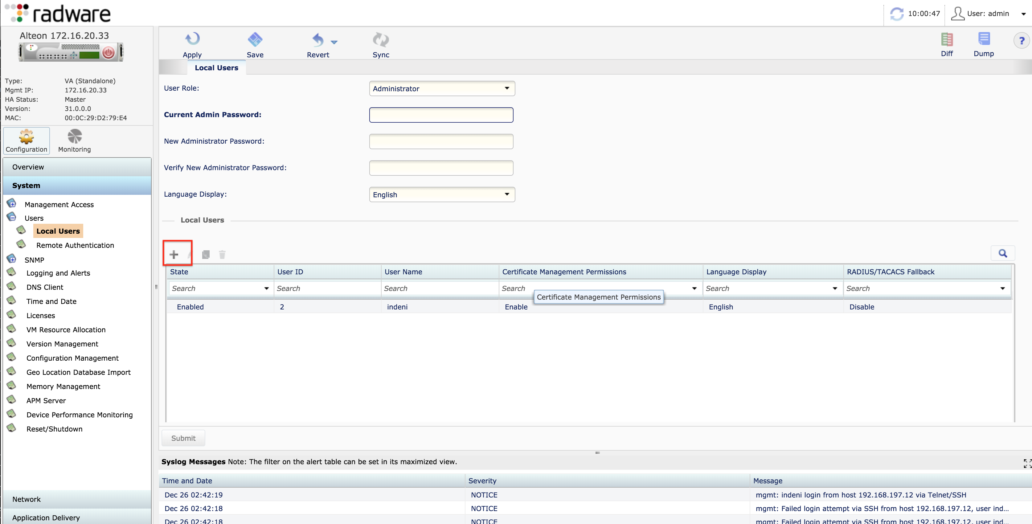 Creating a New Local Administrator Account in Alteon: