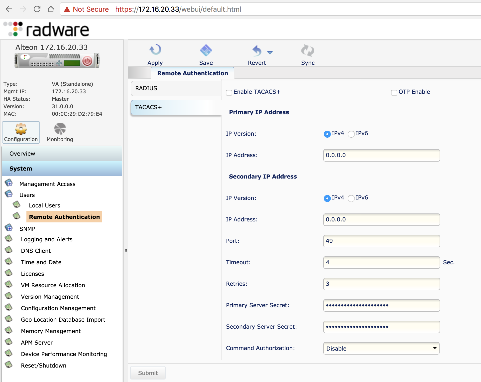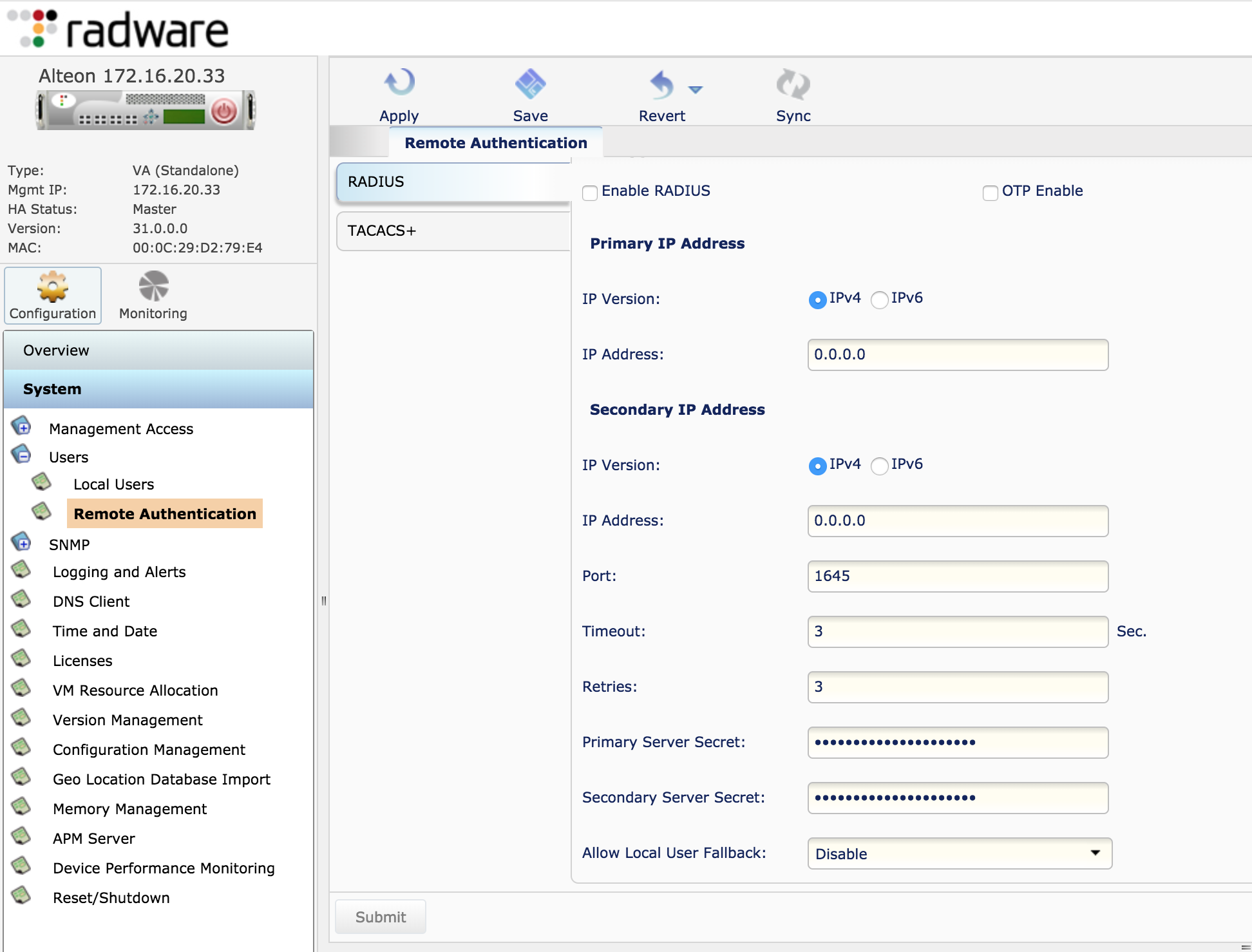c. Optional Configuration: You can enable fallback to RADIUS/TACACS should the local database fail at any point. This allows Radware to communicate with the RADIUS/TACACS server configured for authentication/authorization. Please read the Alteon application user guide to properly configure this.