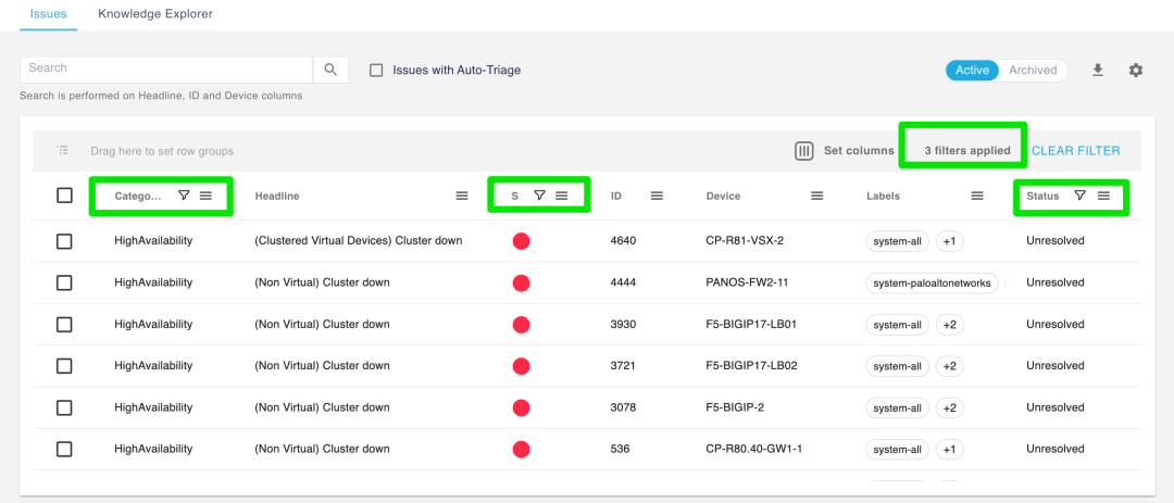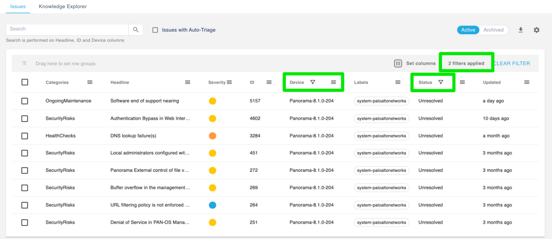 Use Label to filter the issues by severity for a vendor or a group of devices. The default label is system-all. Use the toggle to select unresolved issues, resolved issues, or both. The default toggle is set to unresolved issues. Filter out issues by severity. For example, you can deselect Warnings and Info from the list of issues.
