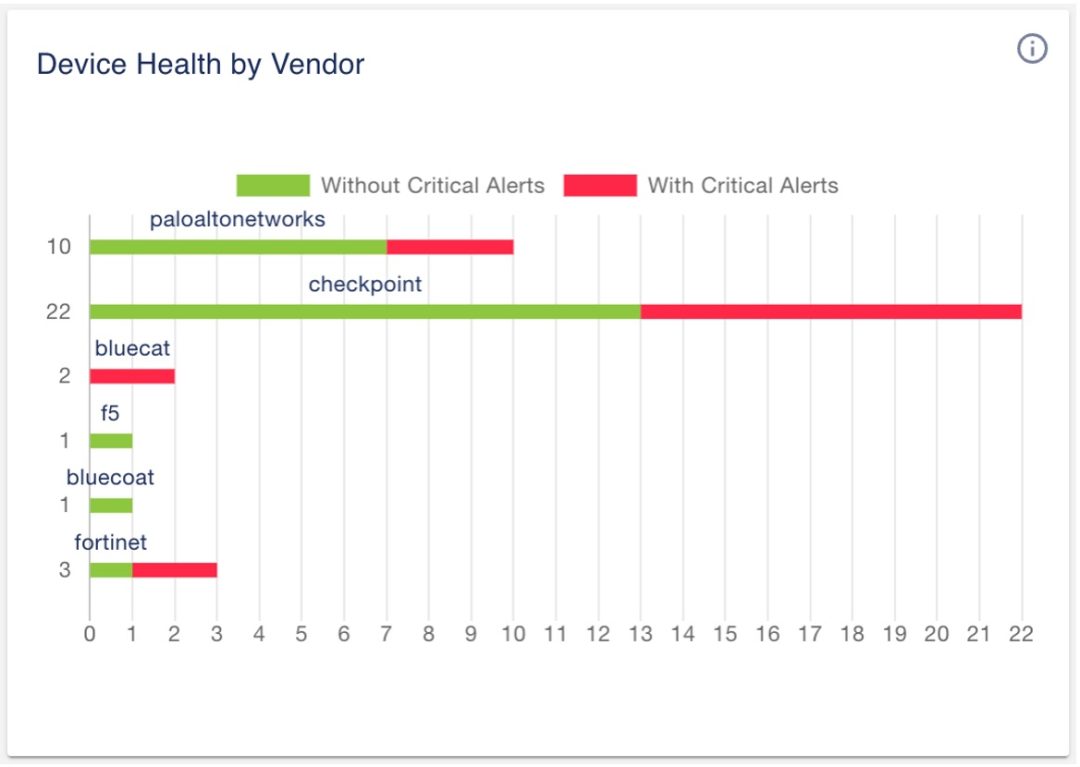 Please Note: Prior to 8.2, the dashboard factors all devices in the Indeni system including suspended devices. However, for devices that have been suspended for an extended period of time, the vendor of these devices can become unknown. This is the reason why you may see discrepancies in the total number of issues per vendor and the total number of issues in the ‘Active Issues by Severity’ widget.
