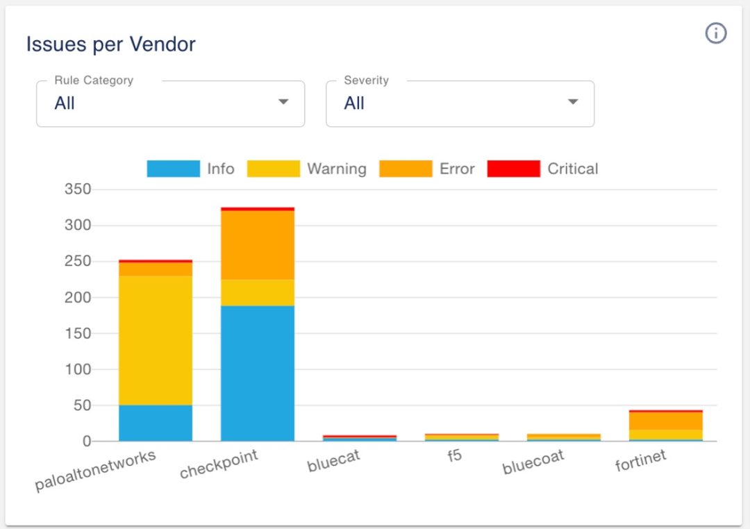 Issues per Vendor shows the distribution of issues by severity for each vendor. It also shows the total number of issues as found by Indeni aggregated for each device vendor.
