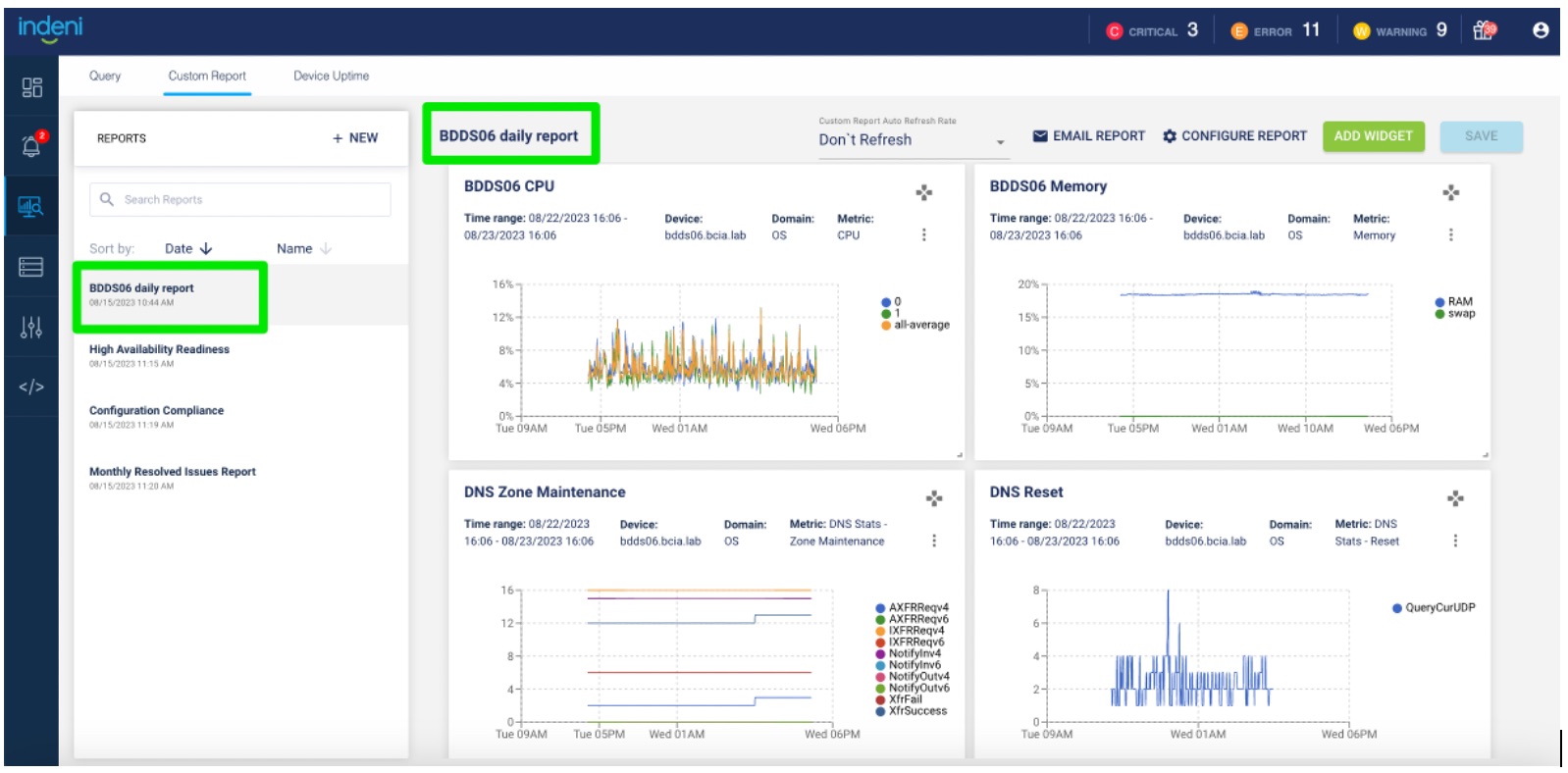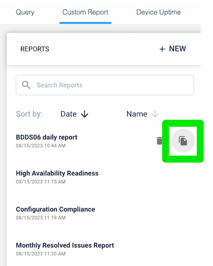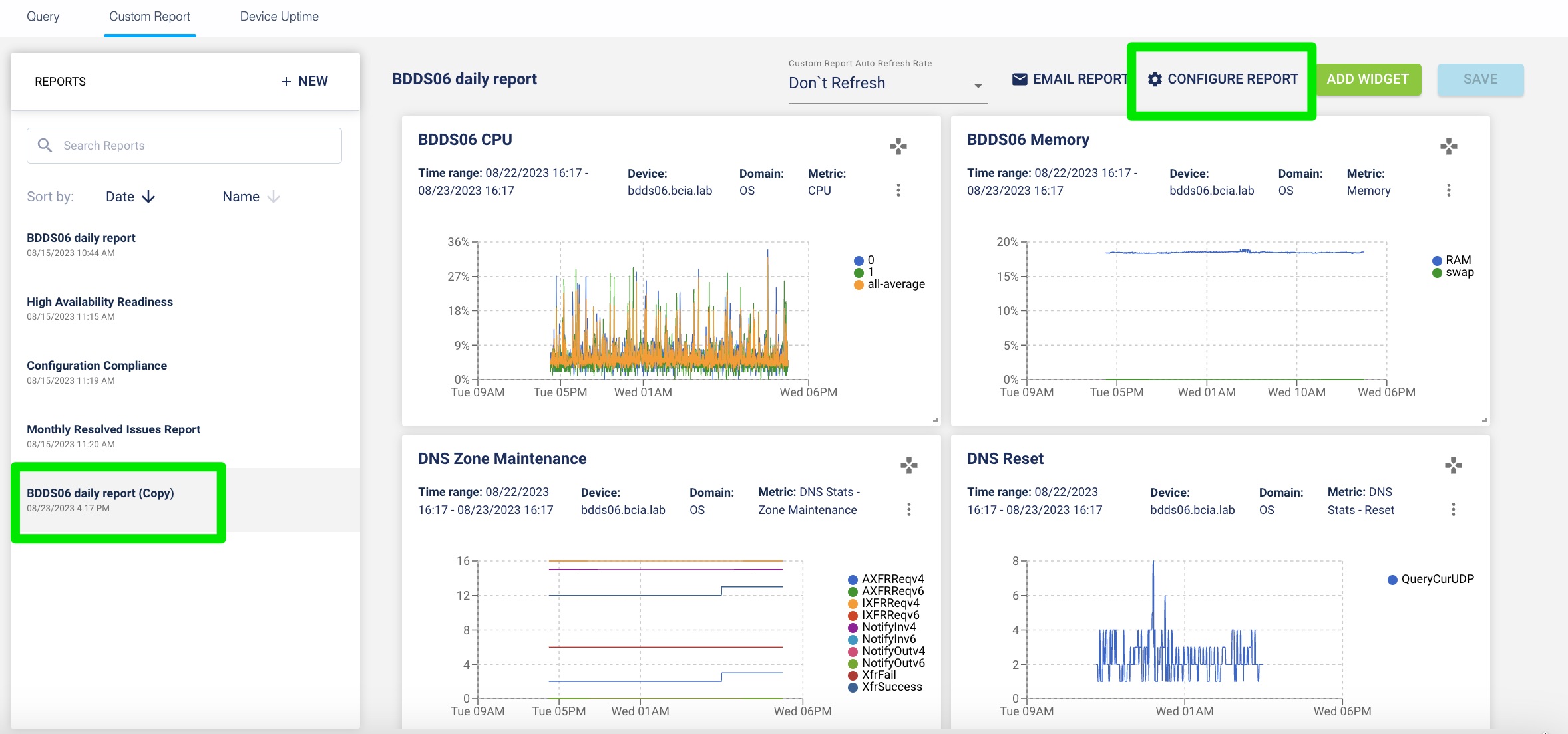 Sometimes, you need to create reports that are only slightly different from a pre-existing report. Instead of creating a new report and re-applying all of the configurations, you can just clone it instead. For example, you just built a daily report for your DNS server. It includes important metrics such as CPU, memory usage and DNS statistics. You can clone a report for a different device. To clone a report, follow these steps:- Navigate to the report you want to clone. In this example, hover to ‘BDDS06 daily report’ as shown.