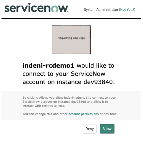 To verify the details before proceeding, click on the TEST button. If the communication was successful, the user who is the resource owner will be prompted to authorize or deny the application access to their account. Essentially, the user must explicitly grant the indeni application access to the ServiceNow account.
