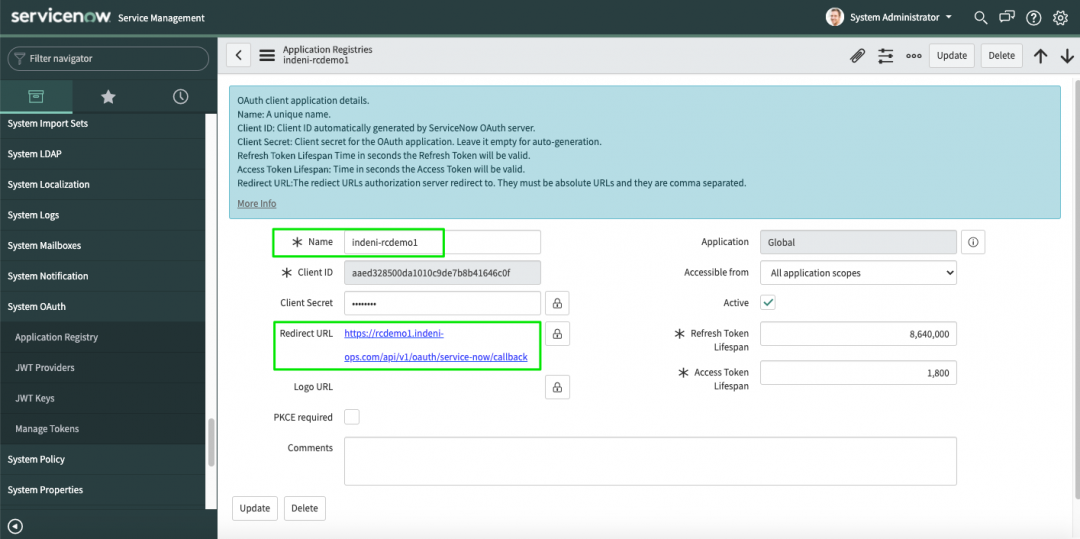 ServiceNow automatically generates a unique Client ID for each client application. The Client Secret is the shared secret string that both ServiceNow and Indeni use to authorize communications with each other. Leave the field blank and ServiceNow will automatically generate a client secret. Copy the Client ID and the Client Secret as you will need to enter this information for the ServiceNow integration setup.