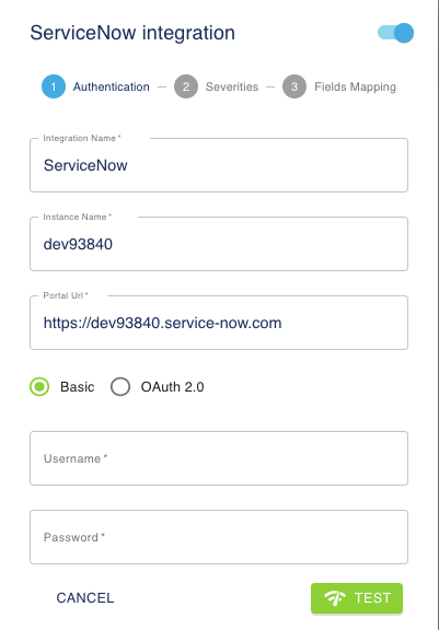To get started with configuration, enable ServiceNow from the UI: Settings > Integrations > Add New Integration > ServiceNow