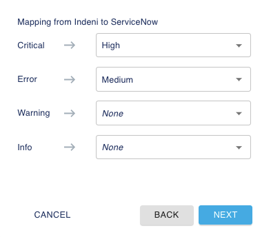 While Indeni categorizes issues as critical, error, warning and information, ServiceNow supports three levels of impact the issue has on business.