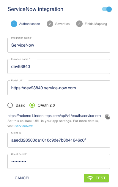 You have the option to select either basic using login credentials or OAuth2 authorization. For OAuth2, you must create an OAuth application endpoint for the indeni client application to access the ServiceNow instance. Note: ServiceNow admin role is required for this task. Refer to the ServiceNow documentation for more details (documentation for the ServiceNow Orlando release).