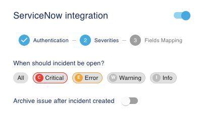 Step 2: Define what severity issues you want Indeni to automatically open an incident ticket. You can also specify if Indeni should automatically archive the issue upon successful creation of an incident ticket.